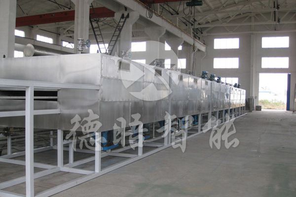 物料由加料器均匀地铺在网带上,网带一般采用12-60目不锈钢丝网,由传动装置拖动在干燥机内移动。干燥机由若干单元组成,每一单元热风独立循环,部分尾气由专门排湿风机排出,废气由调节阀控制,热气由下往上或由上往下穿过铺满物料的网带完成热量与质量传递的进程,带走物料水份。网带缓慢移动,运行速度可根据物料温度自由调节,干燥后的成品连续落入收料器中。上下循环单元根据用户需要可灵活配备,单元数量亦可根据需要选取。