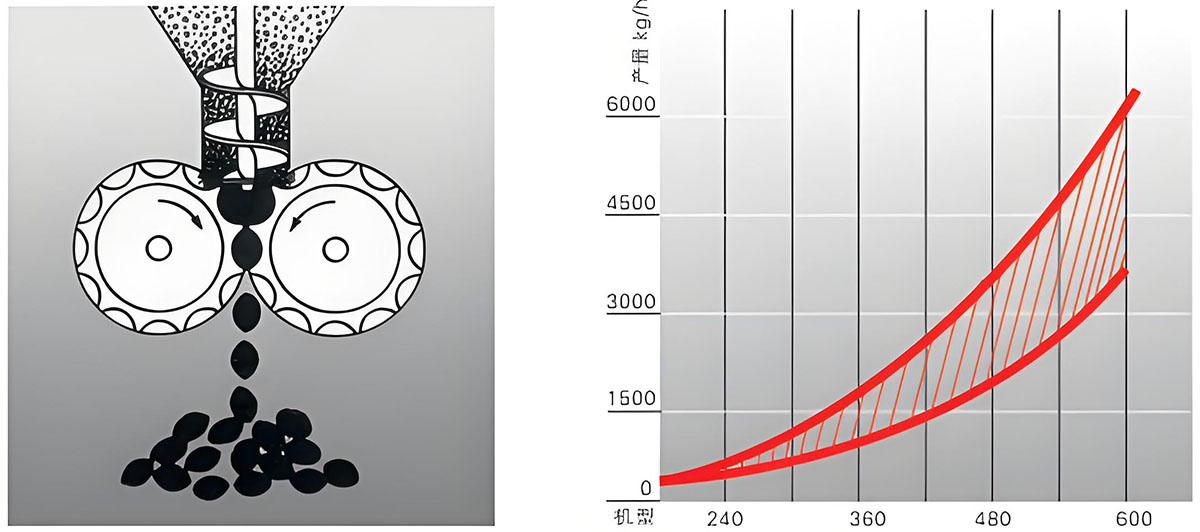 粉状物料由振动给料斗经横向螺旋送料器定量,均匀地加人轧片主料斗,使轧片主料斗内保持恒定的料粒,然后由轧片主料内的纵向锥螺旋对粉料进行预压缩并输送到两只压辊的弧形槽口,两只压辊表面均匀分布形状相同的半扁圆形弧槽或菱形槽,通过一对齿轮的啮合传动,使两只压辊等速,反向旋转,将锥螺旋输送至槽口的物料咬入槽内并瞬间强制压缩,物料经过压缩后随着压力逐渐减小在其弹力及重力作用下,从槽内脱落,进入破碎整粒系统,然后根据用户的粒度要求过筛、分级,获得符合质量要求的均匀颗粒状产品,筛下粉重新返回振动料斗循环利用。