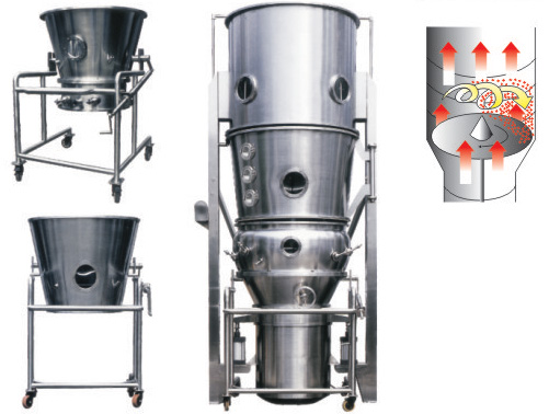 粉末或者母粒在旋转流化床内,受到环隙空气浮力,旋转离心力,自身重力作用,呈环周绳股状,粘合剂或包衣液喷入料层形成真球度极高的丸粒或连续均匀的衣膜。
